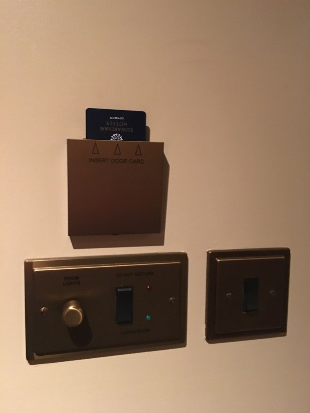 We spent a couple of minutes fumbling in the dark before we read the sign saying you had to insert your door card (room key) in a slot on the wall to make the power sockets and lights work: