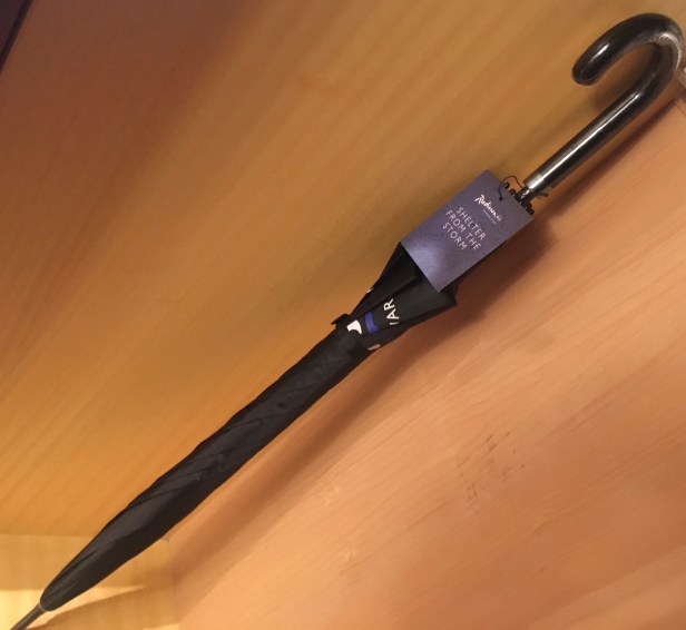 Like it says on the umbrella tag, the lovely hotel provided shelter from the storm: