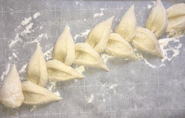 At about a 30° angle, cut the dough to make a “leaf” then move it to one side: