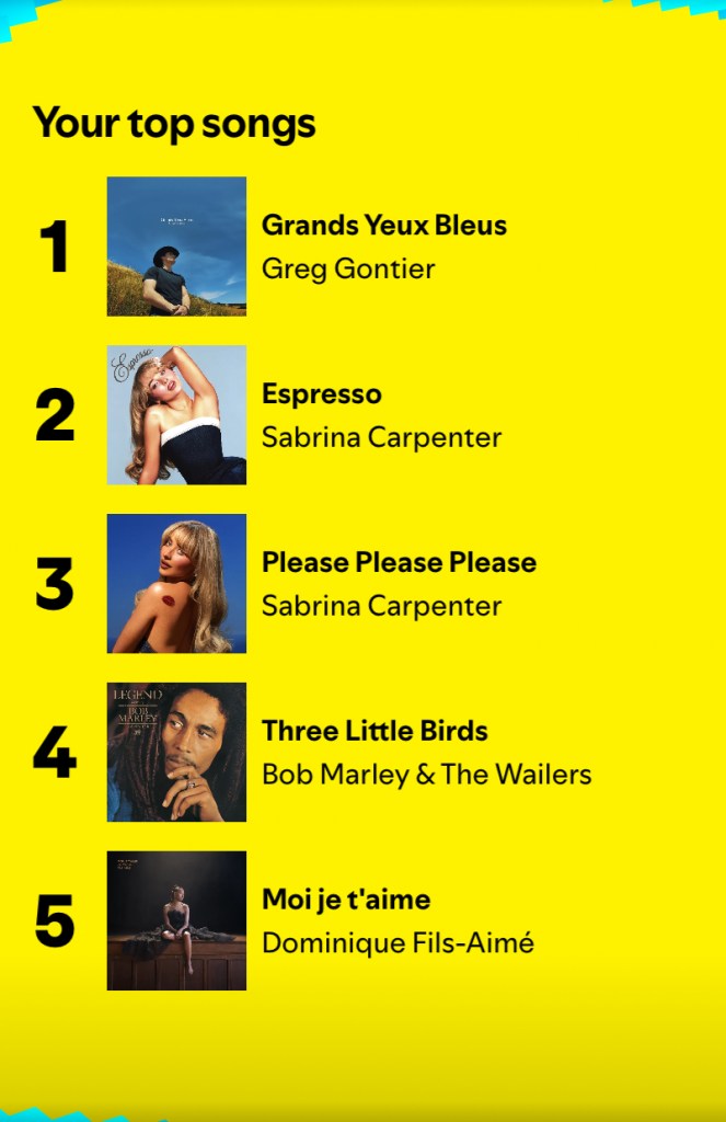 My top songs in 2024 were: « Grands Yeux Bleus » by Greg Gontier; “Espresso” and “Please Please Please” by Sabrina Carpenter; “Three Little Birds” by Bob Marley & The Wailers, and « Moi, je t’aime » by Dominique Fils-Aimé.