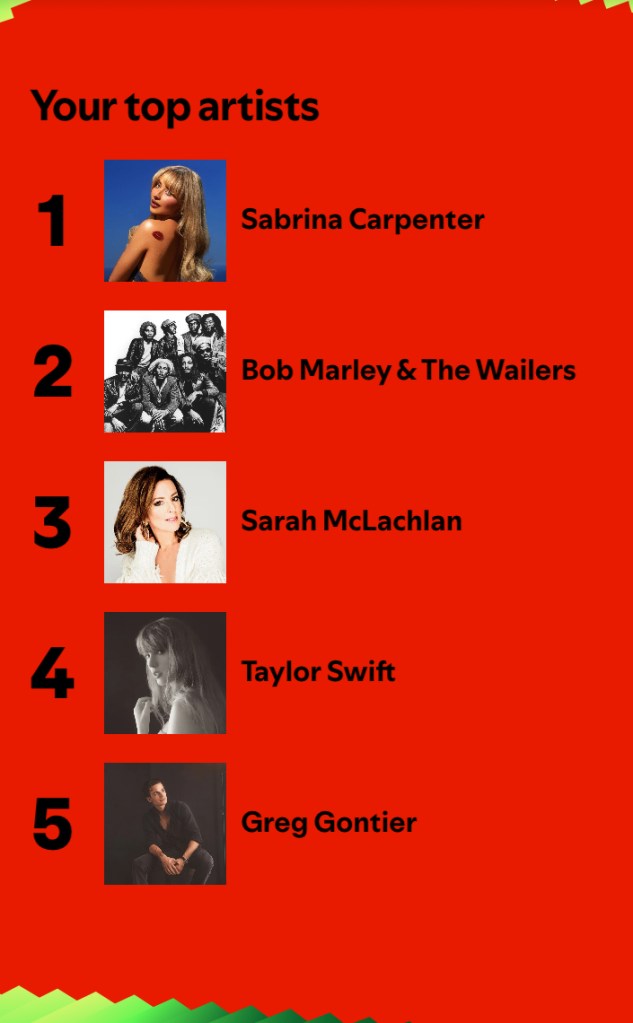 According to Spotify, my top artists in 2024 were Sabrina Carpenter, Bob Marley & The Wailers, Sarah McLachlan, Taylor Swift, and Greg Gontier.