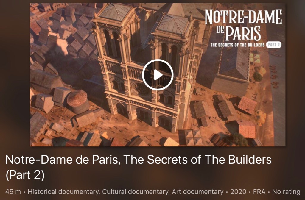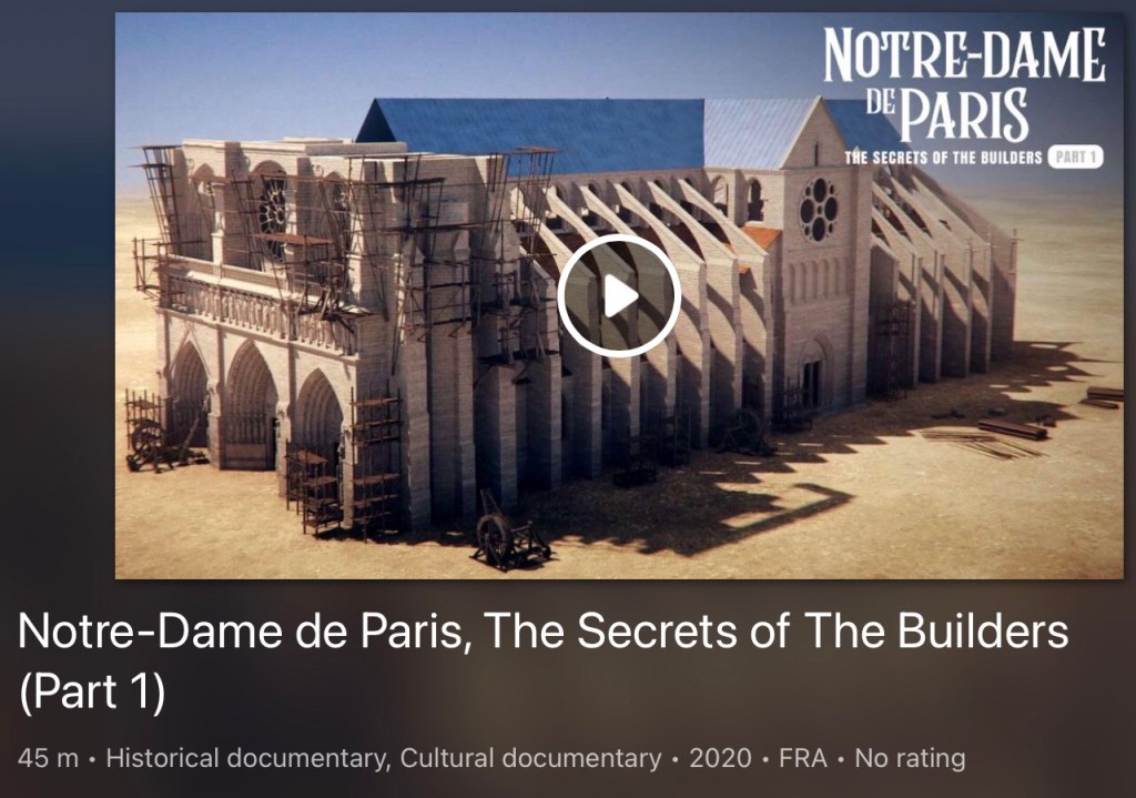 “This film (in two parts) tells Notre Dame’s story, starting in the Middle Ages, when master builders reinvented the art of construction to erect Gothic cathedrals.”