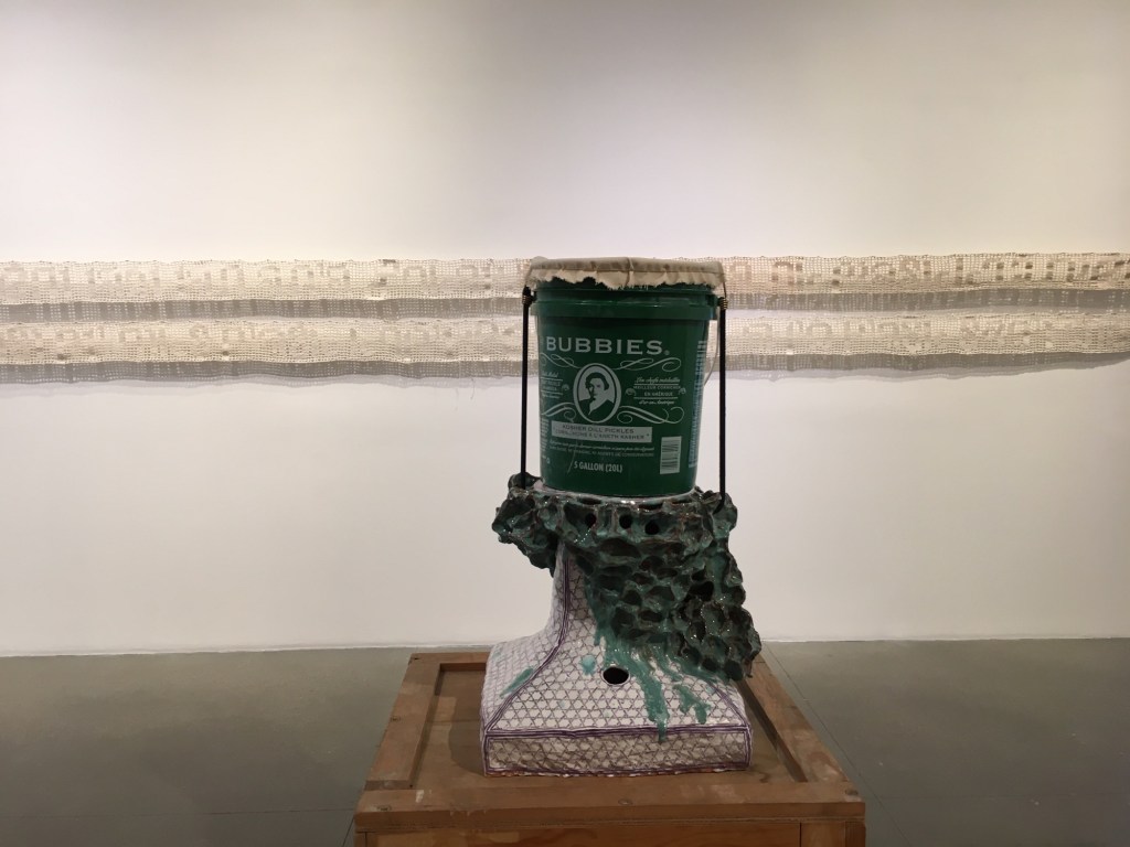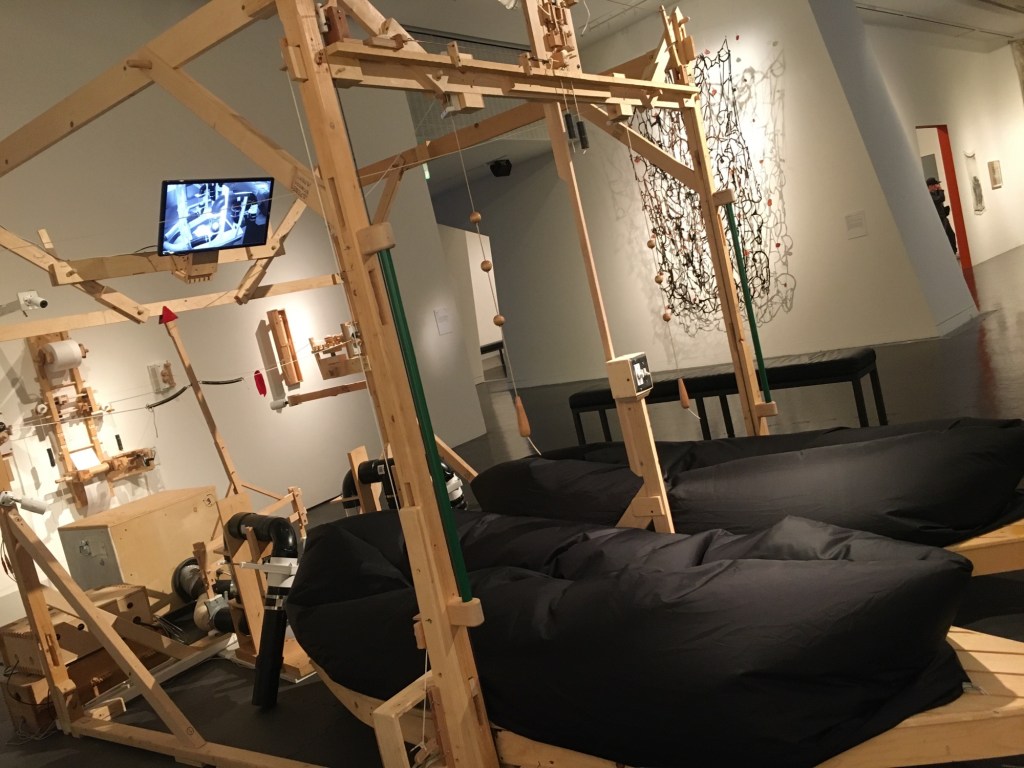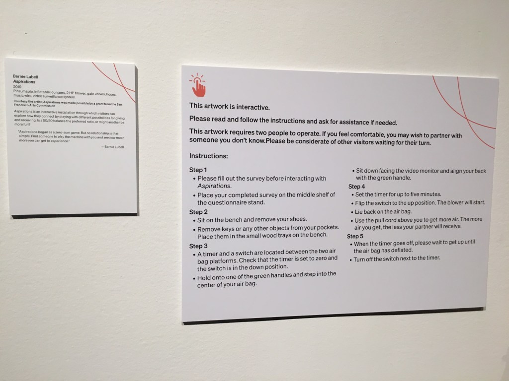 This exhibit requires two participants to sit in the center of each inflatable lounger. It’s an exercise in give and take. To ensure both loungers get inflated, the participants pull on the lever in tandem so that the red arrow is centered.