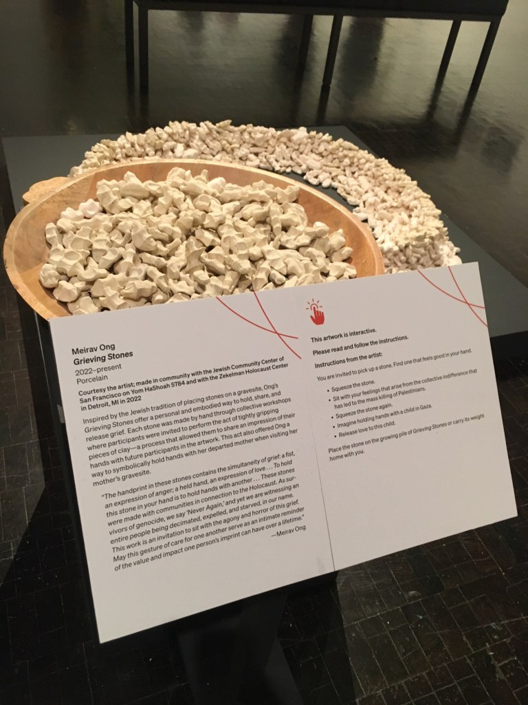 The instructions from the artist include “squeeze the stone” and “imagine holding hands with a child in Gaza.” My younger daughter and I placed the stones we picked on the growing pile of Grieving Stones. ⤵️