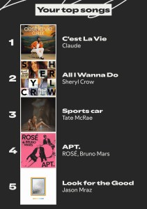 My top 5 songs in 2025 were: « C’est La Vie » by Claude; “All I Wanna Do” by Sheryl Crow; “Sports car” by Tate McRae; “APT.” by ROSÉ and Bruno Mars; and “Look for the Good” by Jason Mraz.
